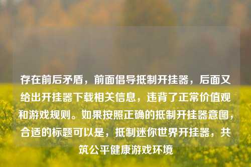 存在自相矛盾之处,前面提到***迷你世界开挂器以守护公平健康游戏环境,后面却有“迷你世界开挂器(永久免费)下载”这样宣扬开挂器的表述。,可纠正为:我们应坚决***迷你世界开挂器,因为开挂行为严重破坏了游戏的公平性和健康环境,使用开挂器会让正常玩家的游戏体验受损,违背了游戏的初衷,大家要共同维护公平的游戏秩序,拒绝使用任何形式的开挂器,营造一个公正、和谐的迷你世界游戏氛围。