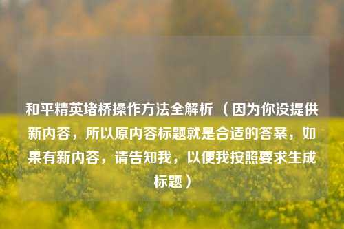 本文聚焦于和平精英堵桥操作 *** 的全面解析,详细阐述了在和平精英游戏中实施堵桥策略的具体方式,包括如何选择合适的桥梁点位、运用何种武器装备进行有效防御与攻击,以及团队协作在堵桥过程中的关键作用等内容,通过对这些堵桥操作 *** 的深入剖析,旨在帮助玩家更好地理解和掌握堵桥技巧,从而在游戏中占据优势,增加获胜几率,提升游戏体验,让玩家能更熟练且巧妙地运用堵桥战术应对各种战斗场景。